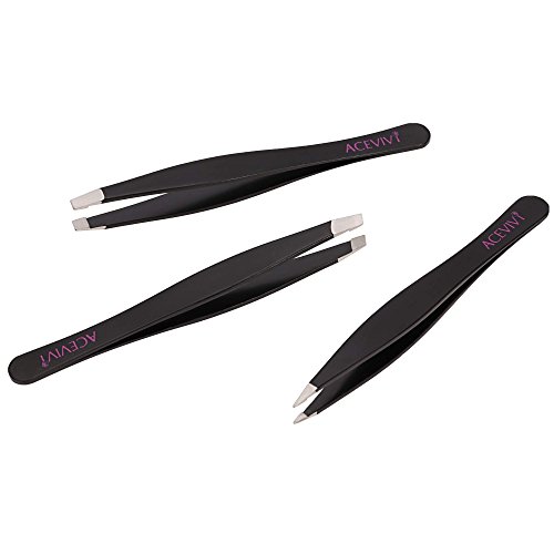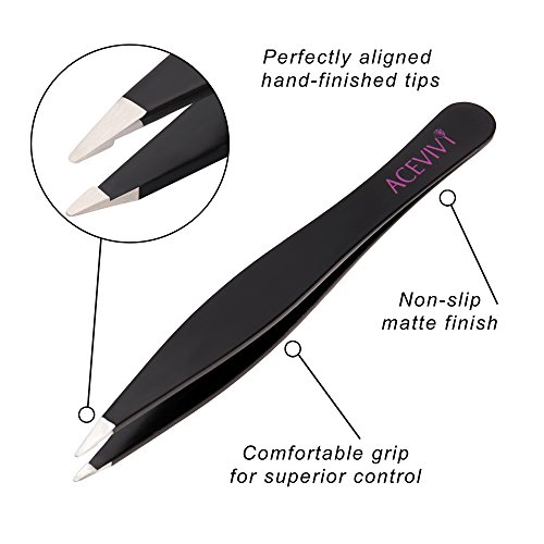 ACEVIVI Black Slanted Flat Tip Stainless Steel Hair Eyebrow Tweezer Tool Set - FREE Leather Case is available in Kits