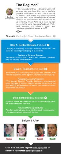 Hi everybody, I'm Dan. Twelve years ago I started Acne.org to share a regimen that I discovered with the world. Acne.org is a community-based web site with message boards and a huge supportive community. Acne.org is ad-free and there is no cost to the user. Acne.org is completely self-supported by our small extremely high quality product line. You do not have to order my products to use the site or to follow The Regimen. I teach you how to use common drugstore products with The Regimen as well. We have an amazing printable guide to buying drugstore products on the site. I suffered for years with acne and tried everything. Like many of you have probably experienced as well, nothing worked. So, I went to work researching everything I possibly could about acne and after years of trial and error I found a treatment routine that cleared me up completely. I made Acne.org to share my regimen with the world. I've been overwhelmed by how well it works for people all over the world. Pretty much everyone who follows it closely gets clear--even people with severe acne. On Acne.org just click the "Get Started" arrow and for complete instructions. I really hope this helps. Let me know what you think. -Dan