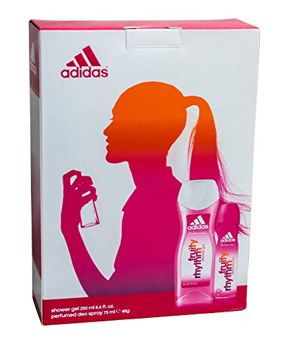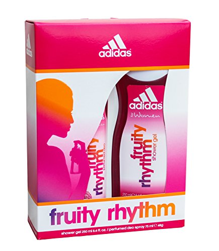 This Fruity Rhythm body care gift set for women by Adidas includes 2 items: 1x Deodorant Body Spray 75ml and 1x Shower Gel 250ml. Beautifully packaged, making it a great present.