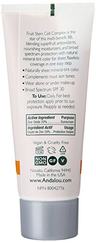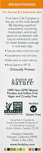 Andalou Naturals Fruit Stem Cell Science renews skin at the cellular level, blending nature and knowledge for visible Brightening results. Fruit Stem Cell Complex is the star of this multi-benefit BB, blending superfruit antioxidants, nourishing moisturizers, and broad spectrum protection with natural mineral-tint color for sheer, flawless coverage in one easy step. Naturally sheer, mineral-tint color Complements most skin tonesWear alone or under make-upChemical-free UVA/UVB protection