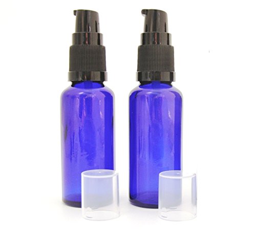 2 x 30ml Blue Glass Aromatherapy Bottle with BLACK treatment pump/lotion pump. Top quality empty brown amber glass bottle suitable for Aromatherapy, Art, Crafts, First Aid, Travel Size Bottle for Beauty Gels, Serums and Lotions is available in Serums & Fluids