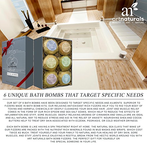 ArtNaturals Presents: Artisanal Quality, Natural Beauty. ArtNaturals Set of 6. 4.1oz Bath Bomb Fizzers, 100% Satisfaction Guaranteed. All Natural Bath Bombs for Spa quality aromatherapy and relief of dry skin and joint pain. Delicate infusions of Shea and Cocoa Butter with antioxidant rich and anti inflammatory Dead Sea and Epsom salts. Free of artificial colors or dyes. Formed with all natural sea clays. 6 unique formulas to target different therapeutic needs including, stress relief, aiding in the relief of sore muscles and joints, and aid in the relief of dry and cracked skin. Ideal for both Men, Women, and Children. Our gentle formula is safe and effective for all skin types. Citric Acid generated fizz which is gentle on your skin. 100% Customer Satisfaction Guarantee. Comparable to Lush Bath Bombs. A perfect gift for the special someone in your life. Free Trade Certified. Paraben Free, Cruelty-Free . Made with Recycled Materials. Art Naturals Artisanal Quality, Natural Beauty.