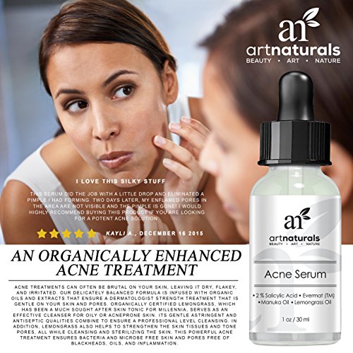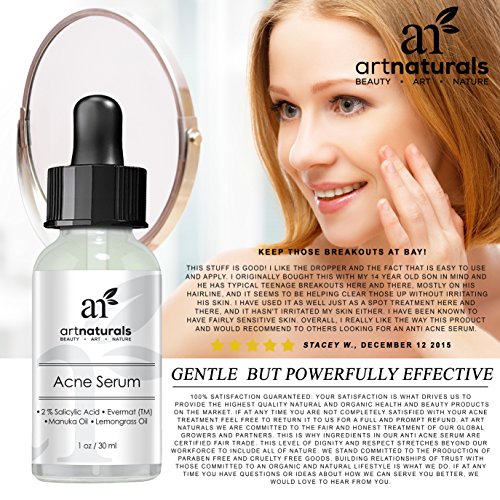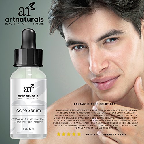 Fighting the effects of acne and inflamed pores is a daily reality for millions of people. At ArtNaturals we have gone to great links to develop acne solutions that combine both proven modern ingredients such as 2%Salicylic and 3% Evermat TM, a revolutionary synthesis of (EnantiaChlorantha Bark Extract, and Oleanolic Acid) with natural oil extracts such as Lemongrass and Manuka. This delicate combination forms an acne treatment that is both gentle on all skin types, yet unsurpassed in effectiveness. See a drastic reduction in pores and powerful exfoliation, anti-inflammatory, antibacterial, and antimicrobial treatment. Ideal for both men and women as well as adult acne and teen & adolescent acne.