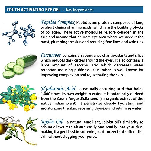 Feel this eye gel go to work from the moment you put it on. A dab of this soothing eye gel instantly awakens and tightens skin around the eyes leaving you feeling refreshed.This potent blend of collagen boosting, skin firming, and wrinkle repairing ingredients leaves eyes looking more youthful and radiant. Rebuilds skin on a cellular level to reveal fresher, healthier looking skin.