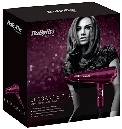 Product description Product Description This BaByliss 2100 W Dryer in a high gloss raspberry colour. It not only looks good, but it also has a sleek and unique design with increased flow of air technology for fast drying. It has 3 heat settings, 2 speed settings and a cold air setting for total control during the drying. An ultra slim concentrator nozzle with smooth flow air vents allows precision styling. Use the high heat and high speed settings for initial drying and a low temperature and speed for styling and scrunch drying. Activating the cold air button on warm hair quickly cools and sets your style for salon quality results. The Instant frizz-control ionic technology works with the ceramic technology to eliminate the frizz and smooth the cuticles for healthy, glossy hair. For easy cleaning the filter has a back hinge and a 2 m no tangle swivel cord offers maximum ease during use. Features: - 2100 W High torque motor for 2 x the air pressure - Ionic technology for condition and shine - heat-balancing ceramic technology - Three heat/two speed settings and cold D 'Air Blow - Hinged rear filter for easy cleaning - Swivel cord Ultra Slim nozzle no tangle, box contains 1 x BaByliss Elegance Hair Dryer 1 x Ultra Slim Concentrator brochure.