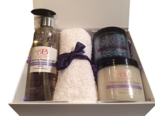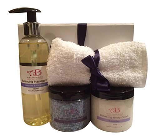 Spa Balancing Pamper Gift Set includes Lavender & Geranium Body Massage Oil, Lavender Bath Salts Soak, Lavender Dead Sea Body Scrub Polish Enriched with Shea Butter is available in Sets