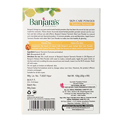 Banjara's kasturi turmeric herbal powder makes you look fresh and fairer after every use. Also, when mixed with sandal powder removes blemishes and pimples making your skin tone uniform.