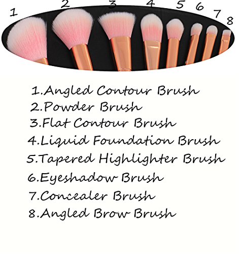 Each kit comes with 8 professional makeup brushes, including: Flat Contour Brush,Angled Contour Brush,Powder Brush,Eye Shadow Brush,Angled Brow Brush,Concealer Brush,Tapered Highlighter Brush,Liquid Foundation Brush.