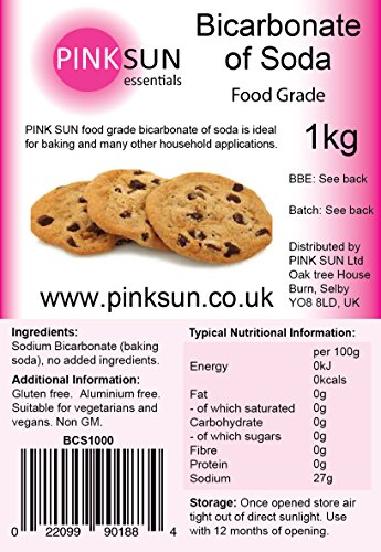 PINK SUN Bicarbonate of Soda (baking soda) consists of food grade, fine white powder primariliy used as a raising agent in baking recipes, but may also be used in homemade personal care products or as an additive free cleaning agent.