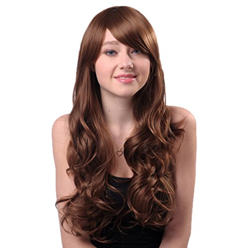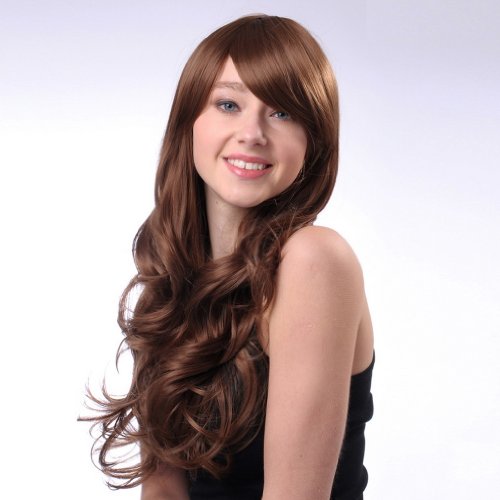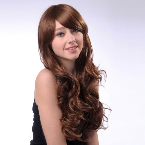 Bigood 68cm Medium hairstyle long curly Inclined bang Fluffy Dark brown wig is available in Polystyrene Heads