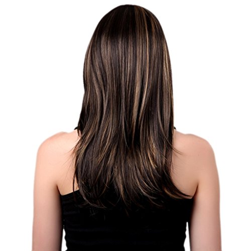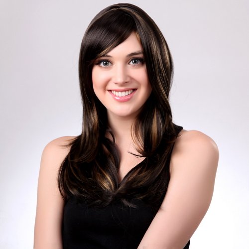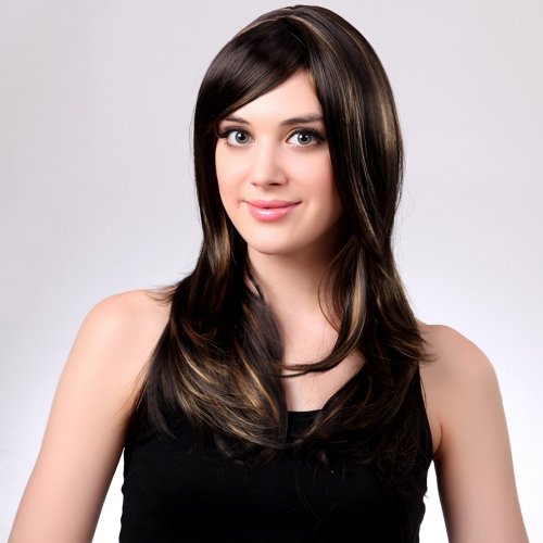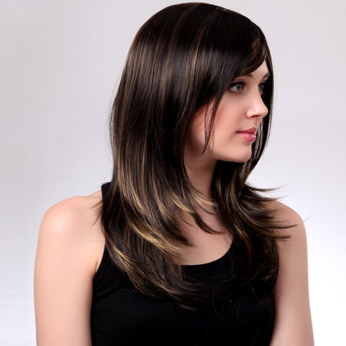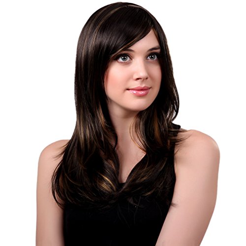 Bigood 65cm Natural Elegant Medium hairstyle Inclined bang Dark brown wig is available in Polystyrene Heads