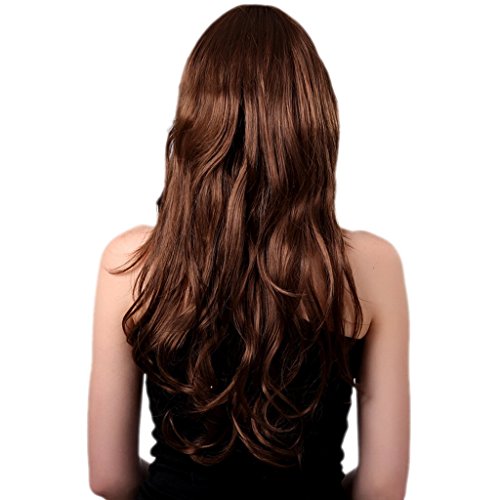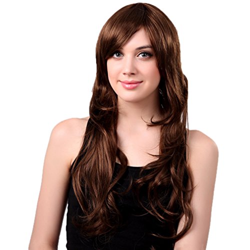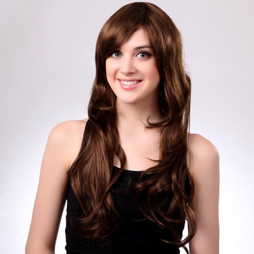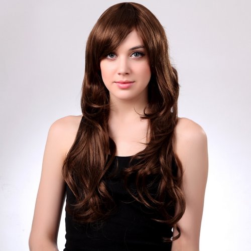 Bigood 68cm Temperament Natural Inclined bang long curly Dark brown wig is available in Polystyrene Heads