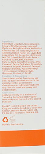 Bio Oil Specialist skincare for: *Scar. *Stretch Marks. *Uneven Skin Tone. *Ageing Skin. *Dehydrated Skin. Bio oil is a formulated to help improve the appearance of scar, stretch marks and uneven skin tone. Its unique formulation is also highly effective for ageing and dehydrated skin. Purcellin oil: bio oil contains the breakthrough ingredient purcellin oil Which reduces the thickness of the formulation and makes bio oil easily absorbed. Scars: Helps improve the appearance of both new and old scars, whether from surgery, accidents, burns or INsect bites. Stretch Marks: Formulated to helps reduce the possibility of stretch marks forming during pregnancy, teenage growth spurts and rapid weight gain. Helps improve the appearance of existing stretch marks. Uneven skin tone:Helps improve the appearance of pigmentation marks and blemishes caused by hormonal fluctuations. Skin lighteners or excessive sun exposure. Ageing Skin: Helps smooth and tone ageing, sagging and wrinkled skin on both the face and body. Dehydrated Skin: Helps replenish the skin's natural oils, stripped away by factors such as extreme weather, water with high chemical content, frequent bathing and the drying effects of central heating and air conditioning. Daily Skin Care: *Specialist intensive moisturiser. *Soothing after-sun treatment. *Ideal as a bath oil. *Direction & Precautions: *See enclosed leaflet. For external use Only. Do not use on broken skin.In the unlikely event of skin irritation, discontinue use.Individual results may vary,Store in a cool place away from direct sunlight. Application: Apply twice daily for a minimum of 3 months.During pregnancy apply twice daily from the first trimester until after birth.
