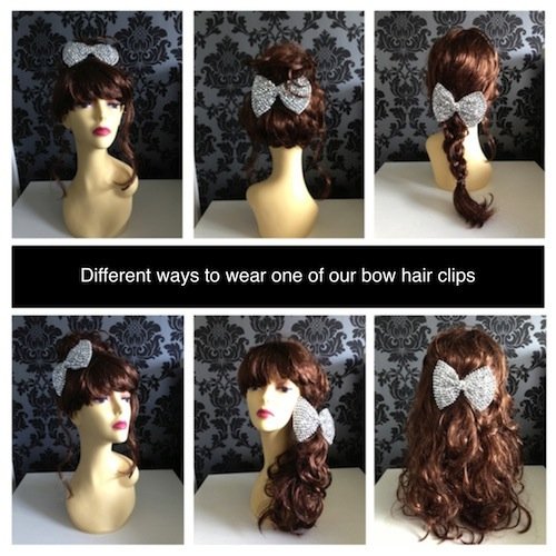 A gorgeous crystal large or double bow hair clip with rhinestone crystals encrusted onto a satin bow. These bow hair clips can be placed anywhere on the head and are a must have celebrity hair accessory.