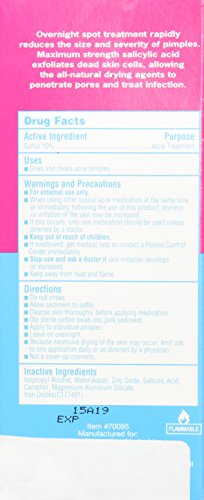 This overnight spot treatment rapidly reduces the size and severity of pimples. Salicylic acid exfoliates dead skin cells, allowing the all natural drying agents to penetrate pores and treat infection.Bye Bye Blemish Drying Lotion is a Hollywood celebrity skin care secret. Life in the spotlight demands the best spot treatment! Features and Benefits Proven spot treatment Reduces pimples overnight Safe for sensitive skin Maximum strength 10% Sulfur formula Net Wt. 1 fl oz 29.5 mL