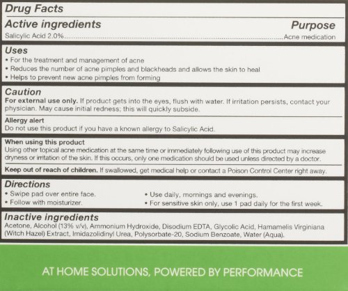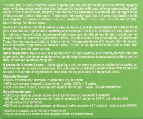 The only at-home facial treatment clinically proven to fight acne and the appearance of fine lines, wrinkles, enlarged pores & age spots at the same time. Using pharmaceutical-grade Glycolic and Salicylic Acids, it improves skin's texture, tone and appearance while reducing bacteria to help clear acne and blackheads without the use of oral antibiotics or topical medications. Non-drying. Non-irritating. Paraben and fragrance free. Directions: Each morning and evening, swipe pad over clean face avoiding the eye area. For sensitive skin, use once daily for the first week, then increase to twice daily. A tingling sensation may occur and is normal. Caution: For external use only. Avoid eye area. If product gets into the eyes, flush with water. If irritation persists, contact your physician. Sun Alert: Prior to sun exposure, cover areas to which the product has been applied with sunscreen. Keep out of reach of children. Net Weight: 60 Peels Ingredients: Active Ingredient: Salicylic Acid 2.0% Other Ingredients: Acetone, Alcohol (13% v/v), Ammonium Hydroxide, Disodium EDTA, Glycolic Acid, Hamamelis Virginiana (Witch Hazel) Extract, Imidazolidinyl Urea, Polysorbate-20, Sodium Benzoate, Water (Aqua).