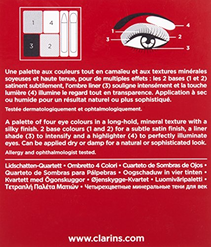 Get the perfect eye look with this collection of wet and dry formula eye shadow quartets. Each palette contains four shades of silky, long-lasting and easily blendable eye colour. Presented in Clarins' signature pale gold compact with mirror and two high quality foam-tipper applicators, one for defining the eye and one for shading and blending, this product makes it easy to get either a natural or an intense, sophisticated look.