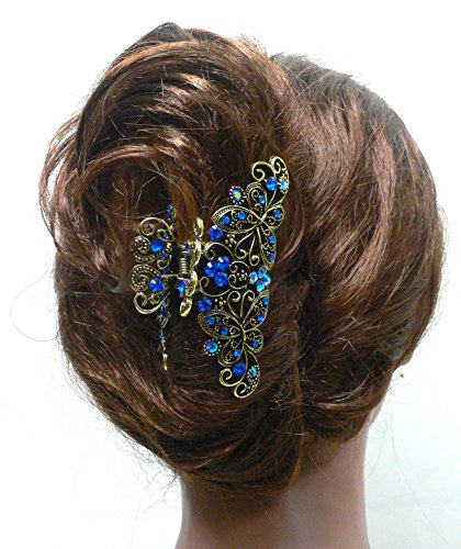 Metal jaw clip in antique gold tone plating, decorated with crystals in shades of sapphire blue and aurore boreale. Size is 88mm wide x 42 mm in height. 14 claws.