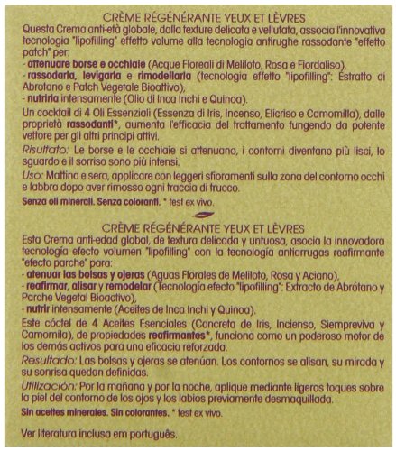 A smooth, silky comfortable eye & lip cream with 4 actions to regenerate the skin and boost its vital functions. It stimulates the production of support fibres in the skin to give it a plumped up appearance and improve its suppleness and firmness and limits the appearance of fine dehydration lines. With Sweet Clover, Cornflower Extract and Rose Petal Extract to soothe and calm, Caffeine Derivative to decongest and soft focus pigments to reflect.