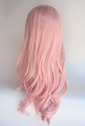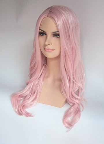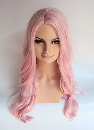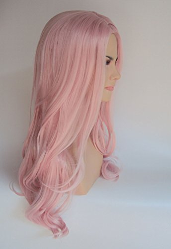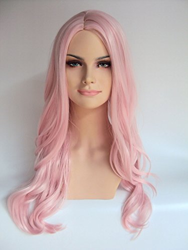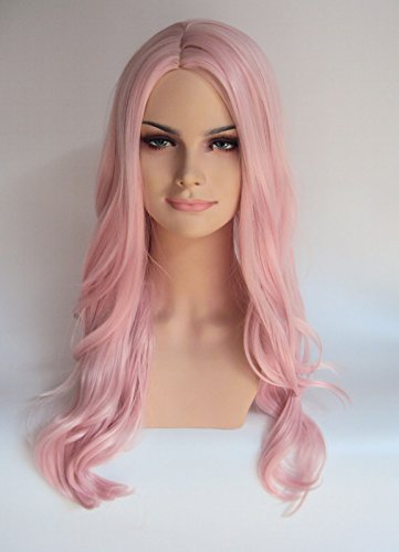 Deluxe Pink Fashion wig. The high fashion inspired wig features a long curly pastel pink layered design with side parting . Made from 100% Premium heat resistant fibre - the most exquisite synthetic material on the market. Feels and flows like real hair with a healthy shine. Sewn onto a high quality wefted colour match cap that will stretch to fit all female and male head sizes. Ideal every day fashion wig