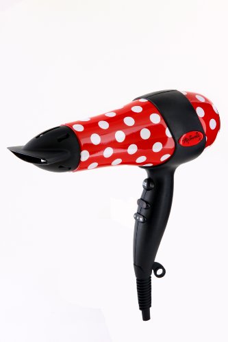 Powerful 2000 watt Hair Dryer. Ionic for smooth conditioned drying. Slim concentrator nozzle for focused airflow. Cool shot function. 3 heat / 2 speed settings. Hinged rear filter for easy cleaning. Hanging loop. Red and white polka dot design. Complete with matching stylish Make Up Bag. Includes UK 3-pin plug. Operates on 230-240v. Will require adaptor/transformer for use outside of the UK. Housed in a presentation box with full instructions.