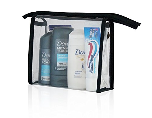 Our Mens Wash Bags are all zipped up in our Clear Cosmetic Wash Bags containing Travel Toiletries. The perfect solution for event organisers, business conferences, airports and travel guests benefiting from Mens Toiletry Bags packed with Branded Travel Toiletries For Men.