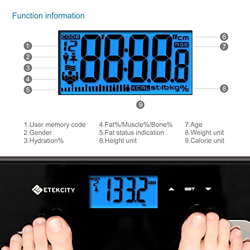 Verified Purchase This review is from: Etekcity Digital Body Fat Analyzer Bathroom Scale, 28st/180kg/400lb, Measures Weight, Body Fat, Hydration, Bone, Muscle and More (Personal Care)