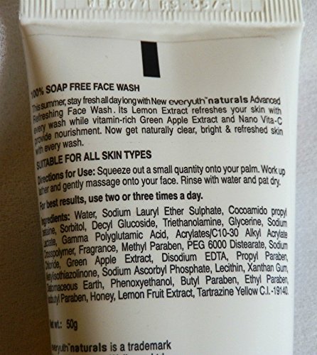Everyuth Naturals Advanced Refreshing Face Wash is a light lemon-yellow coloured gel, which almost looks transparent. It is slightly on the runnier side; if you don't close the flip cap properly, the gel oozes out easily. The gel spreads easily on the face lathering very well. It cleans your skin thoroughly and your skin feels fresh after using this. It does make the skin slightly dry and stretchy. But it did not break me out or anything.