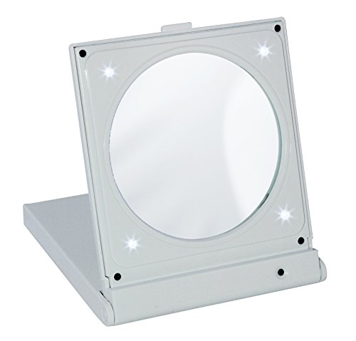 This fabulous 5x magnification white mirror with 4 LED lights is just perfect for popping into a handbag, overnight bag or suitcase and weighs just 290g. Two mirrors,one side plain and one side 5 x mag with 4 LED Lights are protected by an outer folding case (measuring 1.5cm in depth when closed) and would sit neatly between clothes within a suitcase ready to pull out and use just where needed in your hotel room (they never have one in a suitable position) for make up application and grooming. This is one of our best selling travel mirrors and also comes in black and pink 5x magnification. mirrors......... 1st for quality, price and customer satisfaction.