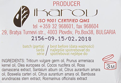 The essential oils -rose and nerouli with their regenerative effect at cells' level stimulate the elimination of old cells and the growth of new ones. The sandalwood and frankincense oils moisturize and soothe the skin, preserve its freshness and smooth the wrinkles leaving it vital, supple and smooth