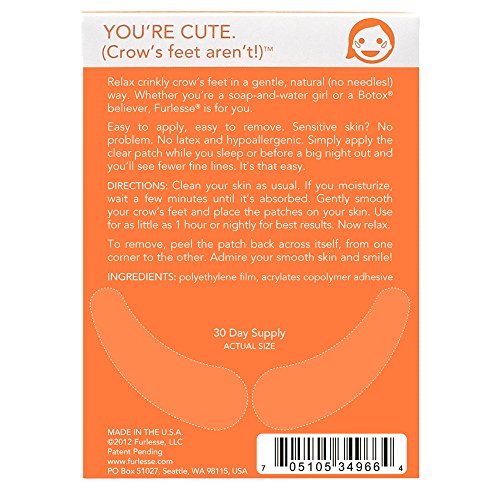 Relax lines around the eyes in a gentle, natural (no needles!) way. Whether you're a soap-and-water girl or a Botox believer, Furlesse is for you. Easy to apply, easy to remove. Sensitive skin? No problem. No latex and hypoallergenic. Simply apply the clear patch while you sleep or before a big night out and a few hours later you'll see fewer fine lines. It's that easy. DIRECTIONS: Clean your skin as usual. If you moisturize, wait a few minutes until it's absorbed. Gently smooth your lines and place the patch on your skin. Use nightly for best results. To remove, peel the patch back across itself, from one corner to the other. Admire your smooth skin and smile!