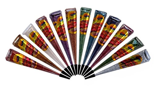 Golecha Instant Multi Color Glitter Gel Cone Tattoo Body Art (Mehandi) 12 Pcs