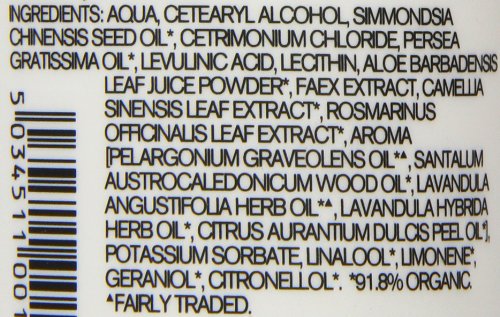 ORGANIC JOJOBA, QUINOA & B VITAMINS For Coloured, Chemically-Treated & Frequently Blow-Dried Hair Chosen as one of the Top 7 Organic Products by The Times! A welcome treat for stressed out hair (Wheat protein and B vitamins help strengthen hair from within) Boosts shine and nourishes scalp and hair shaft (Green Tea, Horsetail and B vitamins) Prevents scalp dryness and loss of natural oils (Aloe Vera, Jojoba and Quiona) For a deluxe conditioning treatment, wrap hair in towel and leave for 10 minutes before rinsing. Free from SLS/SLES, artificial fragrances, parabens, ethyl alcohol and unnecessary synthetic ingredients. Ingredients: *Herbal Infusions of: *Equisetum arvense (horsetail), *Thea sinensis (green tea). Cetearyl alcohol (plant wax extract), *Aloe barbadensis (aloe vera), Cetrimonium chloride (conditioning agent), *Simmondsia chinensis (jojoba oil), Chenopodium quinoa (quinoa oil), Lecithin (plant protein), Faex (vitamin B), *Citrus reticulata (mandarin oil), *Citrus aurantium bergamia (bergamot oil), *Citrus aurantium dulcis (sweet orange oil), Citric acid (from citrus fruits), *Pelargonium graveolens (rose geranium oil), Santalum austrocaledonicum (sandalwood oil), *Lavandula angustifolia (lavender oil), *Citrus sinensis (orange oil), *Linalool, *d-Limonene, *Geraniol, *Citronellol (from essential oils). 92.0% certified organic ingredients. 200ml
