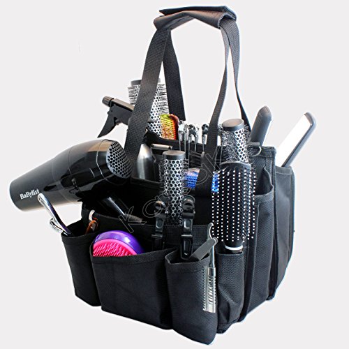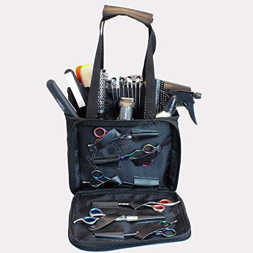 PLENTY OF COMPARTMENTS INCLUDING ZIPPED FRONT POCKET TO HOLD 6 PAIRS OF SCISSORS TWO LARGE MIDDLE POCKETS, TO HOLD BRUSHES, STRAIGHTNERS, HAIRDRYERS, SPRAYS ETC. AND A FURTHER 5 POCKETS AT THE BACK TO HOLD OTHER ITEMS, SUCH AS CLIPPERS AND TRIMMERS. INCLUDES ADJUSTABLE SHOULDER STRAP