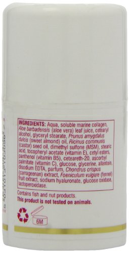 ÆTERNA GOLD COLLAGEN CRÈME SERUMCollagen Crème Serum helps to firm and smooth the appearance of the skin at any age. Collagen does its restructuring work best at night, during alpha sleep, but it can also be applied in the morning. Crème Serum contains 15% pure marine (non-shark) Collagen, plus MSM, Hyaluronic acid and plant extracts to amplify the effect. Contains nut oil. May not be suitable for people with a fish allergy.Suggested usage: Apply sparingly over face, neck and décolleté after cleansing, using small circular movements until absorbed. Collagen Crème Serum is best used with three capsules of Æterna Gold Collagen Restructuring Complex daily.Active ingredients: Soluble marine Collagen (non-shark), Aloe vera, Sweet almond oil, Castor seed oil, MSM, Vitamin E, Panthenol, Vitamin C, extracts of Comfrey, Irish moss & Fennel fruit, Hyaluronic acid.