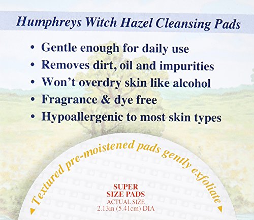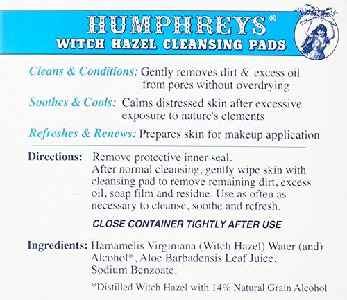 The cleansing power of genuine distilled Witch Hazel now comes in a pad. Humphrey's Witch Hazel cleansing pads are the only pads made with genuine distilled Witch Hazel. They penetrate deep into pores to wipe away dirt, oil, makeup and soap residue - leaving skin soft, smooth and refined - without overdrying.Since 1854, our Witch Hazel Astringent has been used to gently cleanse and soothe even the most sensitive skin. Made from therapeutic extract of the Witch Hazel plant, our exclusive formula penetrates deep into pores, removing dirt, oil and impurities - leaving your skin soft, smooth and conditioned without removing essential moisture.Who should use this product?For most skin types.