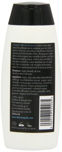 Incognito aftersun moisturiser uses a unique blend of natural ingredients to not only soothe and moisturise your skin but also protect you from mosquitoes and biting/stinging insects. Utilising the well know moisturising properties of Aloe Vera along with korean ginseng and calendula extract, Incognito aftersun moisturiser helps nourish your skin back to well-being even after the toughest day in the sun.