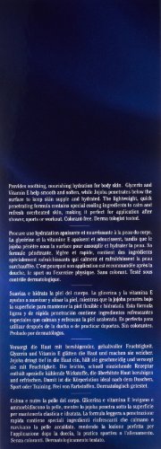 Vitamin E (a powerful antioxidant) protects skin from Free Radical damage while Glycerin smooths and softens dry body skin by maintaining the skin's natural moisture balance. Jojoba oil penetrates below the surface to keep skin supple and hydrated. Soy Protein (rich in linoleic acid) helps nourish damaged cells. The lightweight, quick penetrating formula contains special cooling ingredients to calm and refresh overheated skin, making it perfect for application after shower, sports or workout. Soothes Redness while combating roughness and dryness. Skin feels restored and regenerated without stickiness or greasiness.