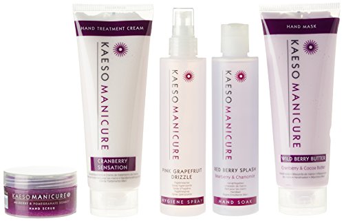 A luscious range designed to promote healthy hands and nails. Manicure kit of 5 products featuring the tantalising scents of grapefruit and summer berries and the intense conditioning action of natural oils of coconut and cotton. Kaeso is sold exclusively for use in spas and beauty salons and your clients will love the perfectly soft, smooth and supple hands that this treatment leaves them with. The kit includes: Includes 1 of each (Includes: 1x Hand Soak-Red Berry Splash. 1x Hygiene Spray-Pink Grapefruit Drizzle. 1xHand Scrub-Mulberry & Pomegranate Sorbet. 1xCranberry Sensation. 1xWild Berry Butter-Cranberry & Cocoa Butter.