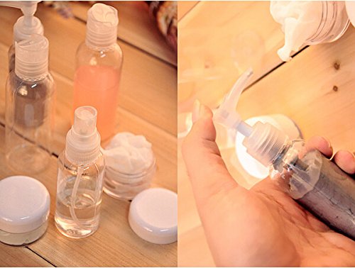 This travel container kit includes:6 total containers with 1 bag.(1*50ml Spray bottle;1*50ml Compressional Bottle;2*100ml Flip cap bottle;2*10g Screw cap cream boxes.) With such a fashion travel kit, you can travel with few things.Just take out the cosmetics and classify them into the bottle!It can help you keep pure,fresh and beautiful in the trip.