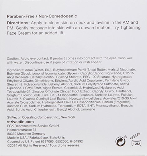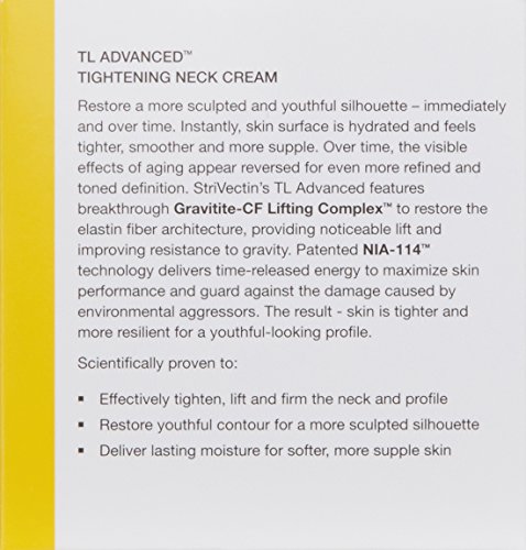 StriVectin TL AdvancedTM Tightening Neck Cream features breakthrough Gravitite-CF Lifting ComplexTM to provide visible lift in the neck and profile area- immediately and over time. Gravitite-CF Lifting ComplexTM contains a powerful blend of technologically advanced ingredients that address the appearance of sagging due to gravity and improve skin elasticity. Instantly, skin is hydrated and feels tighter, smoother and more supple. Over time, the visible effects of gravity appear reversed for even more refined and toned definition of the neck line, profile, and décolleté.