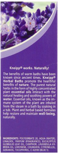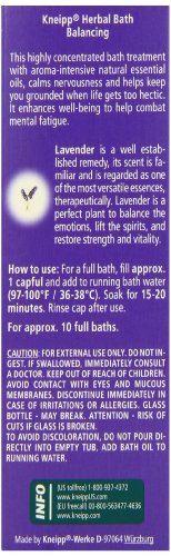 Kneipp Herbal Bath - Lavender Description: Kneipp Herbal Baths bathe away stress strain and fatigue. The purest natural herbs in the form of highly-concentrated essential oils (the plant`s immune system) interact with the natural healing and soothing powers of water. These therapeutic baths benefit body and mind through skin absorption and inhalation. This highly concentrated bath treatment with aroma-intensive essential lavender oil stimulates and balances mind and body. Directions: Add one cupful to warm water. Immerse yourself for 10 to 20 minutes. Sufficient for 10 baths.