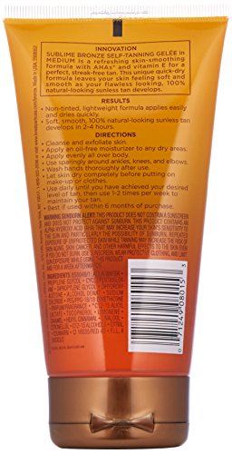 INDICATIONS: Loreal Sublime Bronze contains Vitamin E and gentle AHAs. This ultra lightweight gelee formula dries quickly to provide an even, streak free, natural looking tan and leaves skin with a smooth finish.