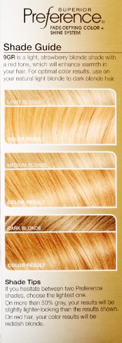 Product Description:Rich Luminous Conditioning Colourant. Optimised fade-defying system. Preference with Optimised Fade-Defying System, creates a rich long-lasting colour spectrum with luminosity, shine and beautiful grey coverage. Care Supreme Conditioner helps lock in first day colour vibrancy and keeps hair silky and resilient week after week. From roots to ends, colour won't fade-out, turn dull or brassy. Preference Shade Guide: 9GR is a light, strawberry blonde shade with a red tone, which will enhance warmth in your hair. For optimal colour results, use on light blonde to dark blonde hair. Preference Shade Tips: If you hesitate between two Preference shades, choose the lightest one. On more than 50% grey, your results will be slightly lighter-looking than the results. On red hair, your colour results will be reddish blonde. Pro-Precise Applicator: Extended tip designed to part hair and reach roots quickly, precisely, easily. Fade-Defying Conditioner: 6 Weekly treatments of colour protective Care Supreme Conditioner with UV philtre and anti-oxidant Vitamin E to help defy fade-out and renew shine. Optimised Fade-Defying System Includes: No-Mess Fade-Resistant Colour Gel; Colour Creme in Applicator; Care Supreme Multi-Dose Conditioner; Superior colorist gloves; Insert.
