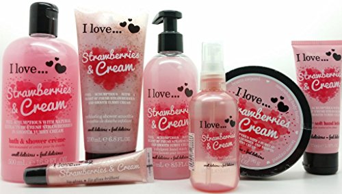 I Love... Strawberries& Cream 7 Piece Luxury Pamper Gift Set Basket Ideal Present Regular size, amazing body treats collection! The products come in basket with gift tag, pull bow and decorations! Feel scrumptious with a burst of fresh strawberries and smooth yummy cream! The set contains: BUBBLE BATH & SHOWER CRÈME INDULGENT HAND WASH EXFOLIATING SHOWER SMOOTHIE NOURISHING BODY BUTTER REFRESHING BODY SPRITZER SUPER SOFT HAND LOTION SHIMMER & SHINE LIP GLOSS
