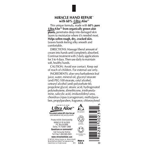 End Dry, Cracked, Red, Rough Hands Forever! Miracle of Aloe's unique Miracle Hand Repair cream is specially formulated with pure 60% UltraAloe gel to provide maximum moisturization and healing power to soften and restore hands. Combined with special moisturizers to effectively penetrate through layers of dry, hardened skin, this highly effective hand cream helps speed up cell renewal and repairs dry, cracked and flaking hands. Just a small amount of this rich long-lasting rejuvenating cream goes to work immediately to soften, moisturize and restore damaged skin. After just one application you'll feel the difference as this rich cream starts to restore your hands. Non-greasy. Lightly scented. Safe for diabetics. Available in travel size 1 oz, 4 oz, 8 oz and 32 oz with Pump.