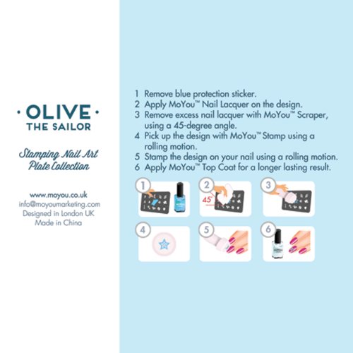 In order to apply MoYou-London designs you will need the following: 1) Nail polish - for best possible results use MoYouTM Special Nail Lacquer, although other brands could work as well. 2) MoYouTM Stamp & Scraper. 3) MoYouTM London Image Plate. Please follow carefully the next steps: 1) Remove blue protection sticker. 2) Apply MoYouTM Nail Lacquer on the desired design. 3) Remove excess nail lacquer with MoYouTM Scraper using a 45ยบ angle. 4) Pick up the design with MoYouTM Stamp using a rolling motion. 5) Stamp the design on your nail using a rolling motion. 6) Apply MoYouTM Top Coat for a longer lasting result.