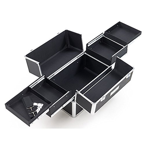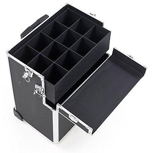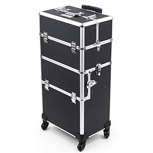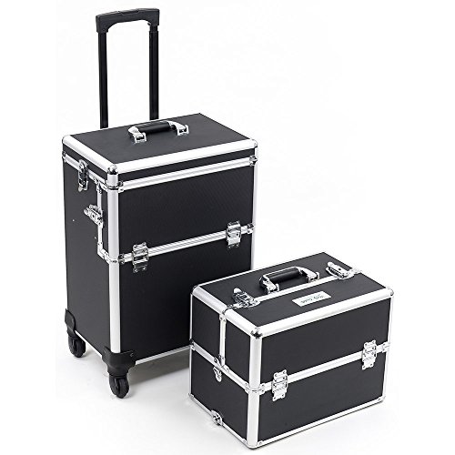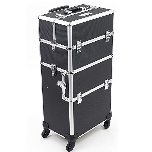 With impressive durable aluminum exterior and reinforcement trim. Inside this makeup studio art case, you'll find all the storage and organization you'll need for all your clients. Inside the removable top beauty tote, 4 Easy-Slide extending trays and a large center storage compartment (w/ removable adjustable dividers) will house all those everyday items and must have essentials. Then unlatch the top case and inside the lower train case on this beauty supply suitcase, you'll find a removable upper tray with adjustable / removable dividers to create the perfect sized pockets for all your glam goodies! Pull out this tray to reveal a large open section extending to the bottom of this make up travel organizer perfect for those bigger and bulkier items. The back panel features several elastic bands to help keep your cosmetic brushes and other special items secured and safe. All around, this cosmetic studio suitcase is the perfect travel companion, with convenient features such as 360 degree rotating wheels, telescoping drag handle, key-lock latches, and heavy duty comfort handles for each case. The included detachable shoulder strap and customizable storage compartments make this the ideal travel solution for anyone who needs versatility and style in one perfect case! Overall Dimensions - 14.5" L X 9.5" W X 33" H; Upper Case Overall - 14.5" W X 9.5" L X 10" H; Upper Case Top Layer Extendable Trays - 6.25" W X 6.25" L X 1.5" H; Upper Case Bottom Layer Extendable Trays - 7.25" L X 6.25" W X 1.5" H; Upper Case Large Center Compartment - 13.75" W X 8" L X 5.25" H; Lower Case Overall - 14.5" L X 9.5" W X 23" H; Lower Case Removable Tray - 13" L X 7.5" W X 3.75" H; Hollow Space Below Tray - 14" L X 9" W X 11.5" H; Telescoping Handle Fully Extended Height - 42" H.