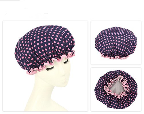 Verified Purchase This review is from: Moolecole Women Polka Dots Printed Waterproof Shower Cap Double Layer Bathing Cap Elastic Band Spa Shower Hat Navy Blue (Misc.)