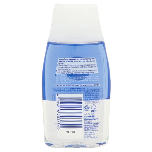 For all skin types. Effectively removes even waterproof eye make-up. Caring formula protects eye lashes - suitable even for the sensitive eye area. Compatibility dermatologically and opthalmologically approved. NIVEA® Daily essentials Double Effective Eye Make-up Remover with a two-phase extra strength formula: The oil phase effectively removes even waterproof mascara and eye-make-up. Specially formulated and tested for the sensitive eye area. The aqueous phase protects and cares for the eye lashes with it's caring formula, without leaving an oily residue.